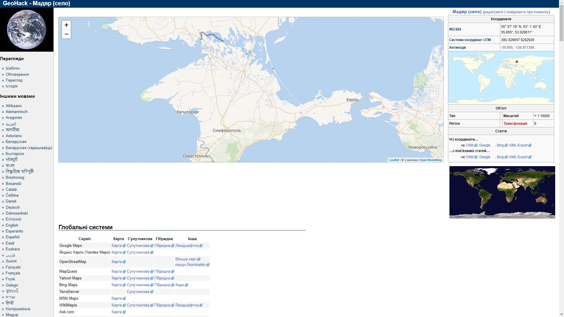 [edit]Hello! GeoHack shows Crimea only Russia, but it's wrong. On OSM to Crimea shown as Russia and Ukraine. Screenshot https://pp.userapi.com/c844618/v844618710/5cc6f/MycMVmRghnM.jpg Will this problem be solved?--AlexKozur (talk) 19:12, 29 May 2018 (UTC)